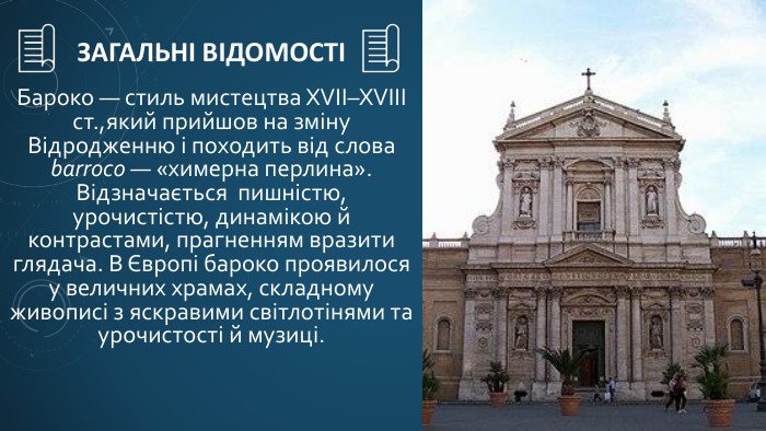 Бароко — це яскравий і емоційний художній стиль, який з’явився в Європі та швидко змінив уявлення людей про мистецтво, архітектуру, музику й літературу, адже він прагнув вразити, захопити та зворушити кожного глядача.